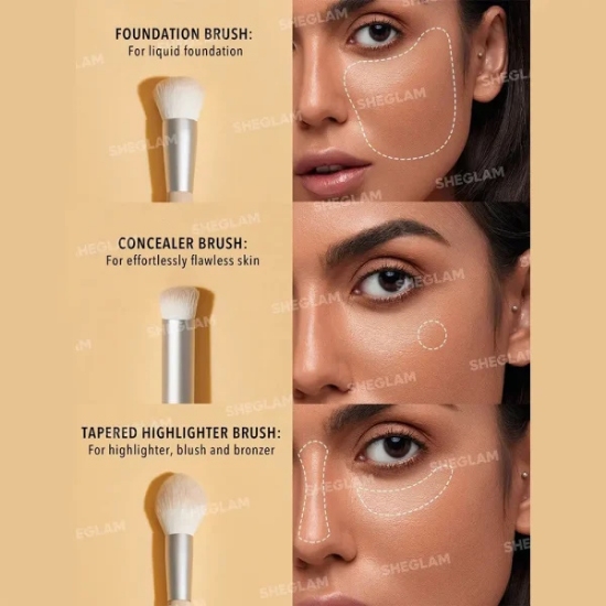 ست براش صورت SHEGLAM دارای سه براش با ۶ سری متنوع است و شامل براش هایلایتر، براش کانتورینگ، براش بلندینگ و براش رژگونه میشود. را بر عهده دارند؛ بنابراین شما میتوانید با استفاده از آن میکاپ صورت بدون نقصی داشته باشید.